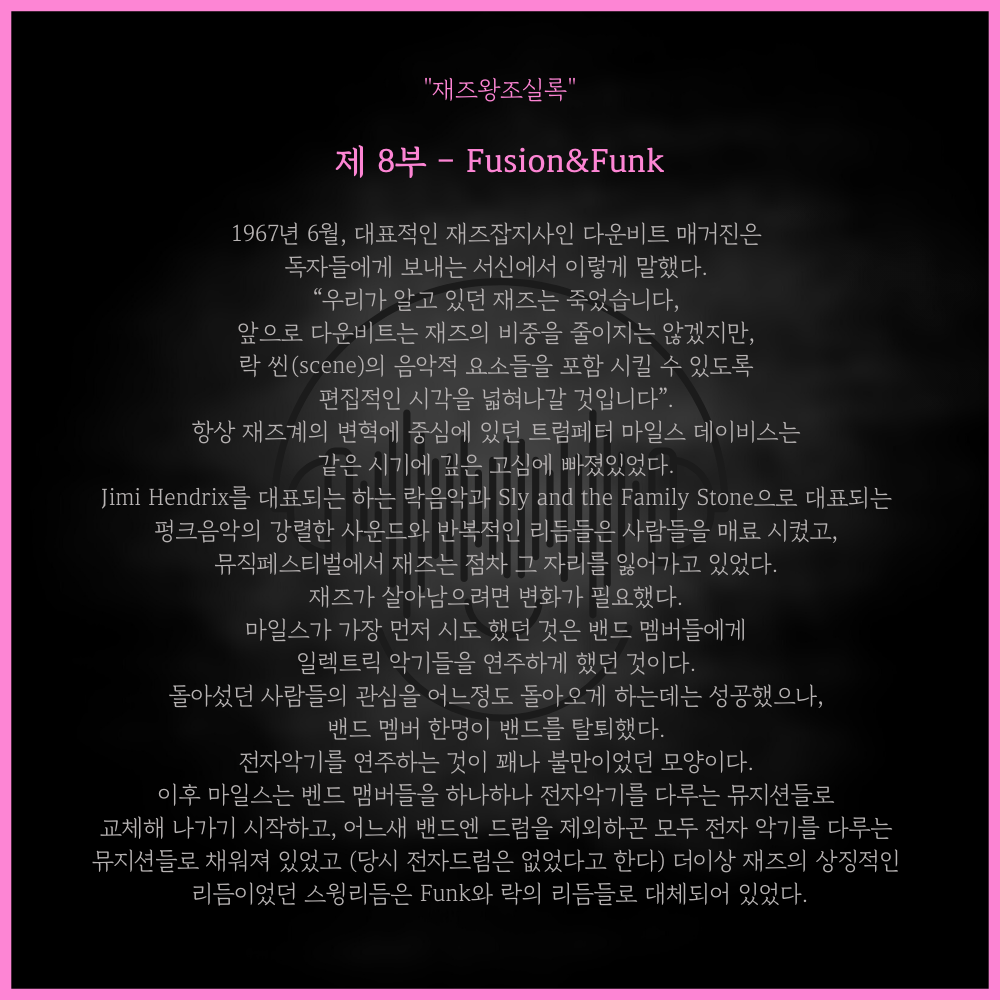 재즈왕조실록 퓨전 편에서는 마일스가 퓨전으로의 첫 발을 내딛은 1960년대 후반부터
