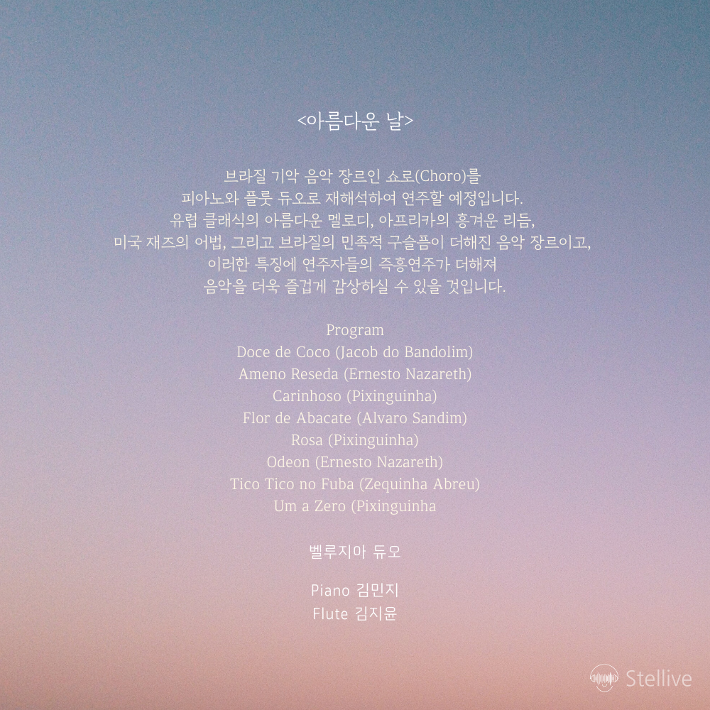 브라질 기악 음악 장르인 쇼로(Choro)를 피아노와 플룻 듀오로 재해석하여 연주할 예정입니다.